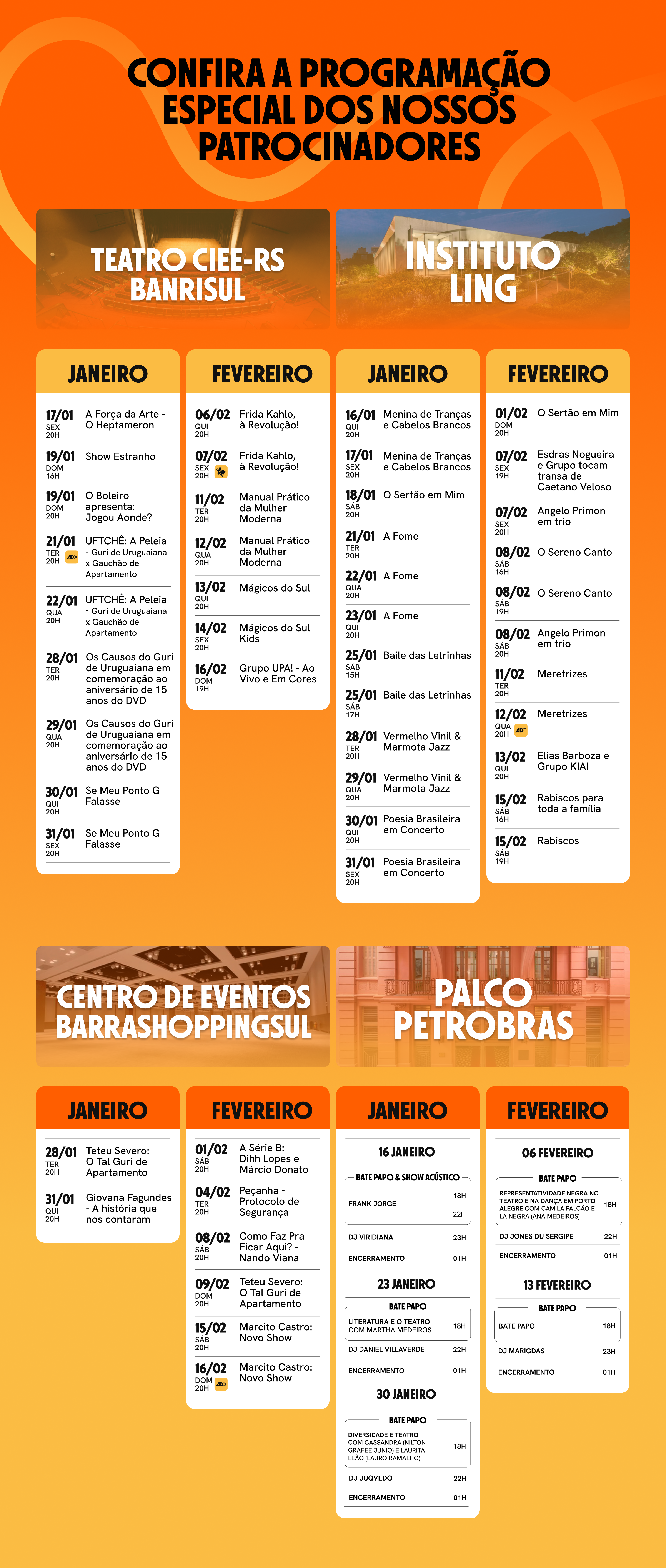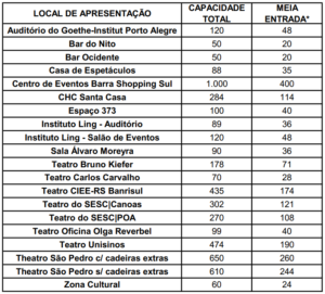 Centro de Eventos do Barra Shopping Sul, CHC Santa Casa, Instituto Ling, Sala Álvaro Moreyra, Teatro CIEE-RS Banrisul, Teatro Oficina Olga Reverbel, Theatro São Pedro e Teatro da Unisinos.
